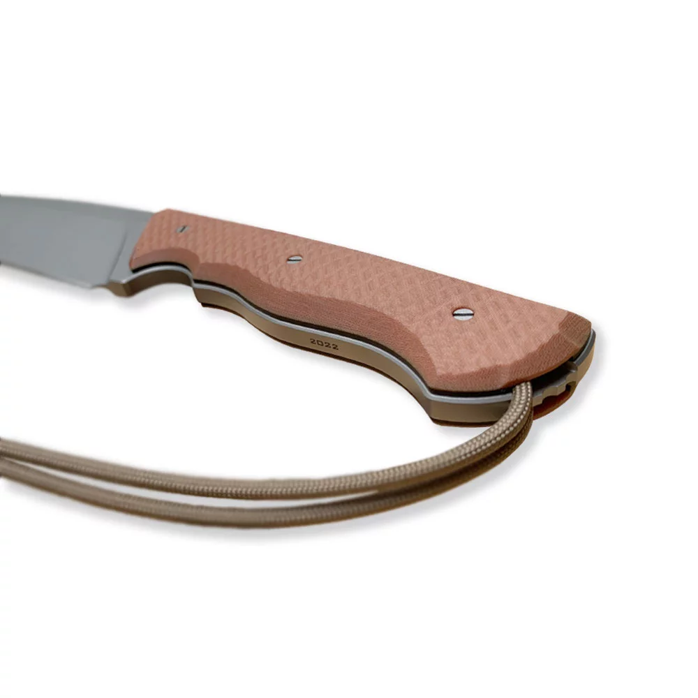 At the end of the knife handle there is a hole for attaching an additional cord, which can be used as a protection against dropping the knife during work, or an additional gripper that facilitates removing the knife from the holster. Originally, it includes a section of paracord with a shade matched to the design.