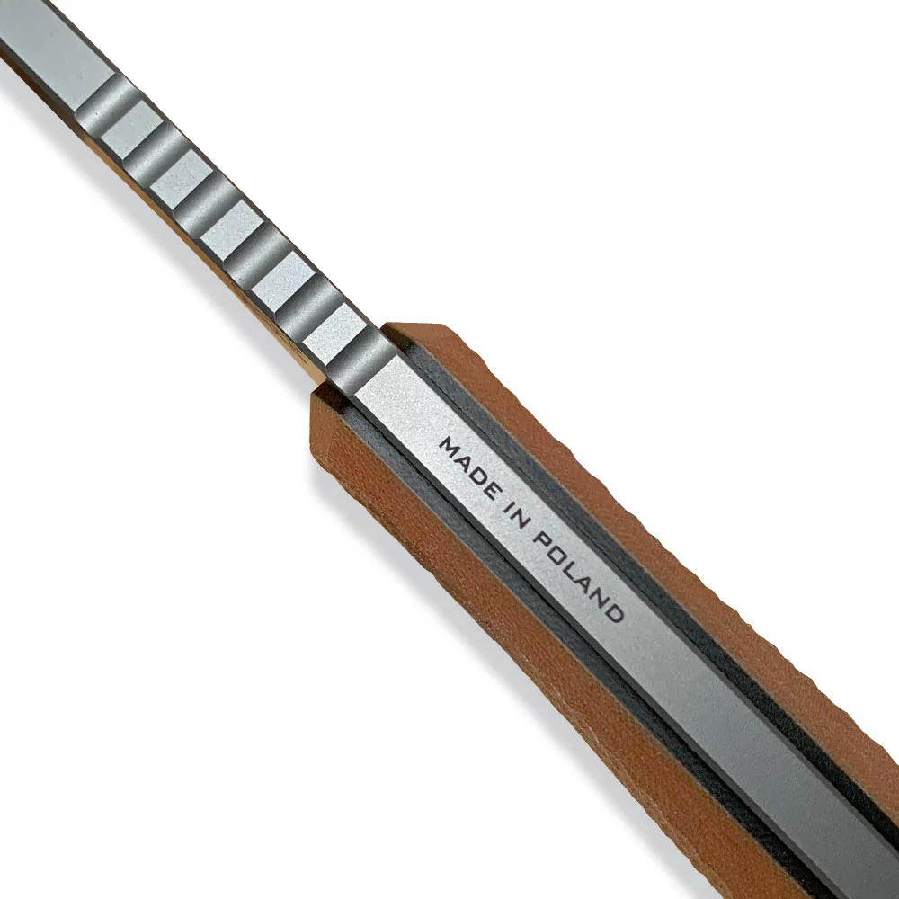 Grips of the handles with an ergonomic, oval shape are made of Micarta laminate (Brown Micarta) with black G10 liners. Micarta is resistant to moisture, temperature changes, most solvents and acids, has a high resistance to mechanical damage. The presented Micarta knife has a rough structure that prevents the handle from slipping in the hand. The handle covers have been screwed together with glass blasted steel screws. The screws complete the knife’s design, elegantly matching the stonewash-style blade. What is important in the construction of the handle is the rounded spine, protruding from each side of the handle, made of the steel protruding beyond the outline of the Micarta cladding. According to some users, this procedure makes the handle even more grippy, and certainly stronger, due to the greater width of the steel in this place.