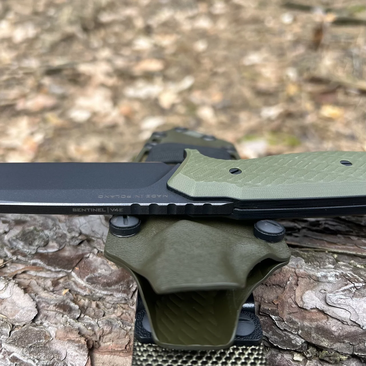 Sentinel knife is usually made of steel that can be subjected to high overload (Vanadis 4 Extra, Vanadis 23, Elmax). The knife is designed for intensive use, therefore the steel used in its production must be appropriate. It should withstand high stress, stay sharp for a long time and not chip. Sentinel is made with a variety of blade finishes (PVD coating, DLC coating). The handle is usually made of G10 composite or micarta, with a variety of colors and various original patterns. For each model, the knifemaker creates an appropriate Kydex holster, the colors of which (holster and accessories) correspond to the colors of the blade and the handle so that the whole is a coherent set.