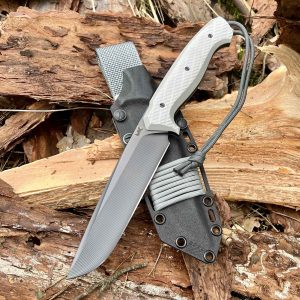 At the end of the handle, a sturdy pin allows for attaching a lanyard, providing extra security against accidental drops. This also helps in quickly retrieving the knife from its sheath and serves as a safeguard against loss. Each Sentinel originally comes with a matching paracord lanyard, which can also hold a decorative knife bead for personalization.